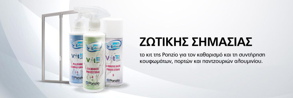 Η υψηλή αντοχή, η τεχνολογία και η ποιότητα των υλικών των κουφωμάτων αλουμινίου Ponzio εγγυώνται ελάχιστη συντήρηση και υψηλή διάρκεια ζωής. Καθώς ο καθαρισμός και η συντήρηση είναι απαραίτητες διαδικασίες για τη διασφάλιση της σωστής λειτουργίας και τη διατήρηση της απόδοσης των κουφωμάτων σας με την πάροδο του χρόνου, έχουμε αναπτύξει το Vitall: ένα ειδικό κιτ για τον καθαρισμό και τη συντήρηση παραθύρων, θυρών και παντζουριών αλουμινίου.