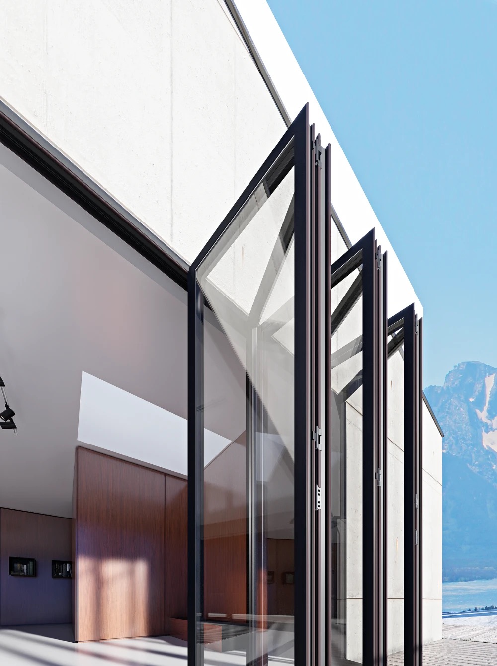 Μπορείτε να επιλέξετε μεταξύ του συστήματος εξωτερικού ανοίγματος, με τις πόρτες που αναδιπλώνονται εξωτερικά για να έχετε πλήρη ελευθερία στη διαχείριση των εσωτερικών χώρων, και του εσωτερικού συστήματος αναδίπλωσης για ελάχιστη επίδραση στον εξωτερικό χώρο.